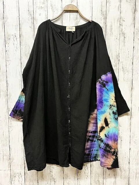 タイダイ染め Tie-dye 前開きワンピース ブラックビューティ 美しい染め色ブラックにオーロラ模様 HD20-59
