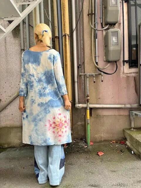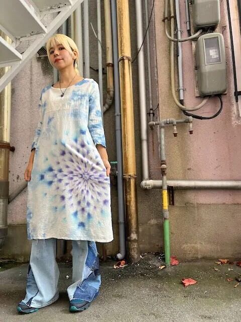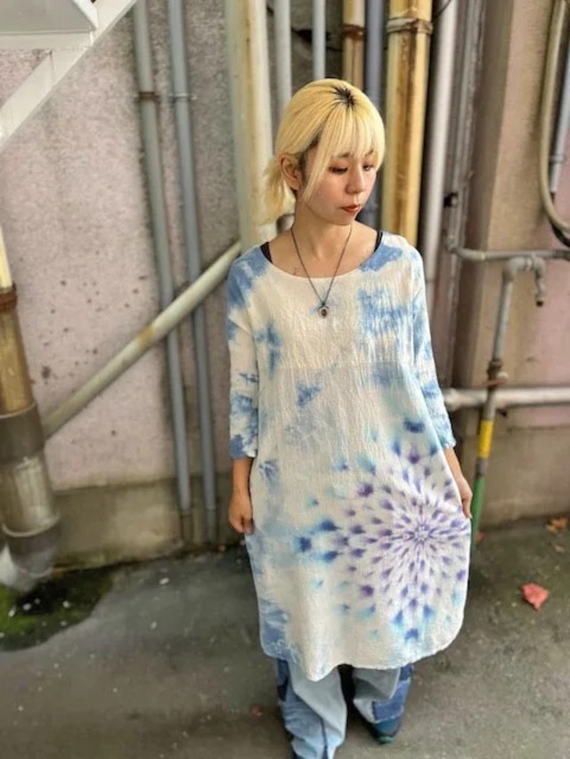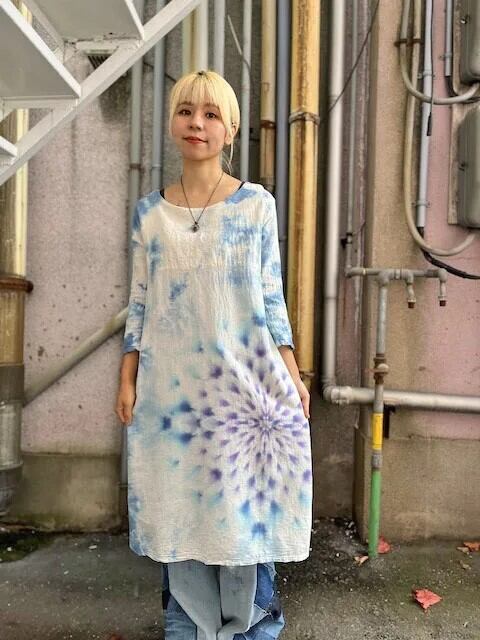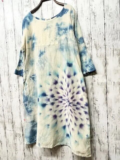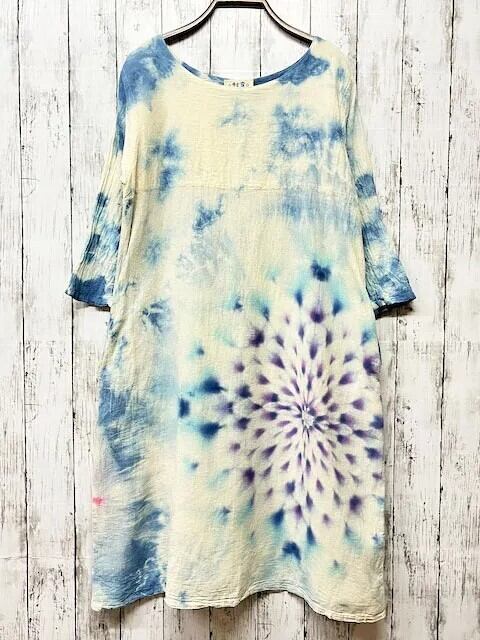 タイダイ染め Tie-dye 長袖ワンピース 優しいブルーのムラ染めに淡く幻想的な宝石のような曼荼羅模様 HD20-81