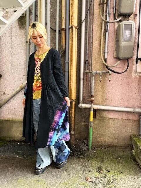 タイダイ染め Tie-dye 前開きのロングワンピース ブラックビューティ 美しい染め色ブラックにオーロラ模様 HD21-35