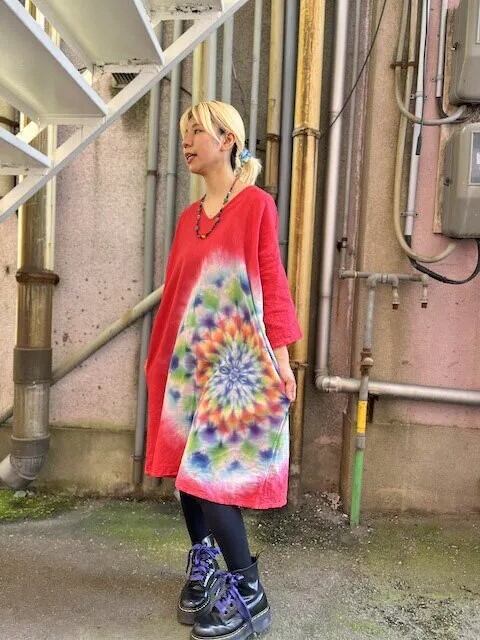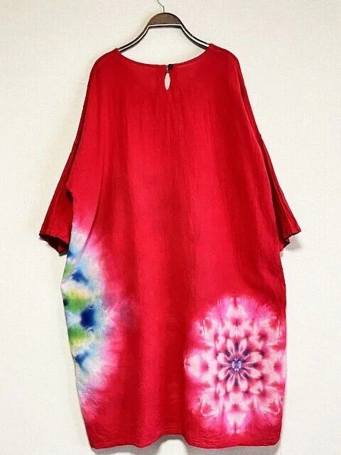 コタイダイ染め Tie-dye ゆったりワンピース レッド 美しい幻想的な大曼荼羅 Hippies Dye最新作 HD21-61