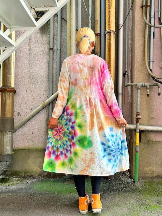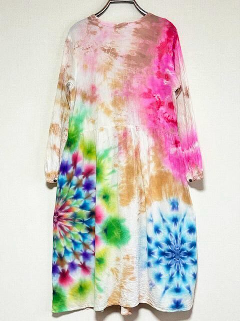タイダイ染め Tie-dye 前開きのロングワンピース 美しいベージュのムラ染めに幻想的なピンクと艶やかな大曼荼羅 HD21-97
