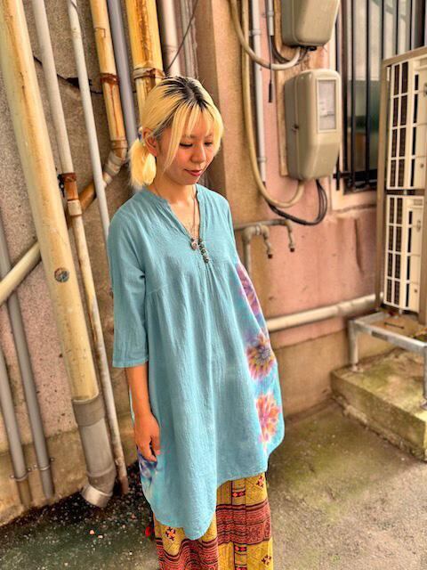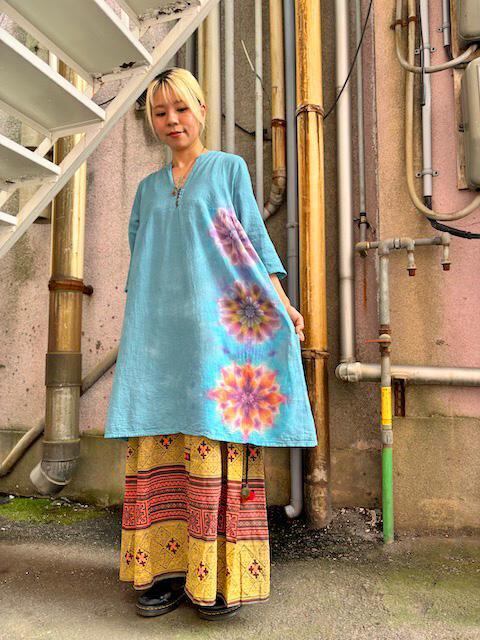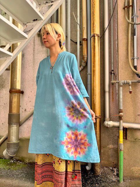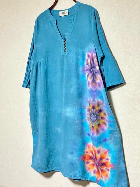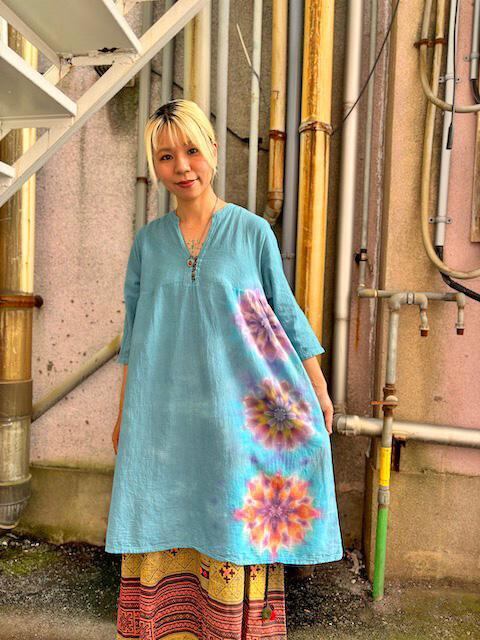 タイダイ染め Tie-dye チュニック ワンピース 淡い蒼色に3連の可憐な花 HD22-24