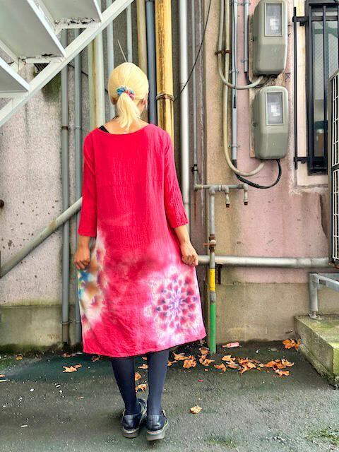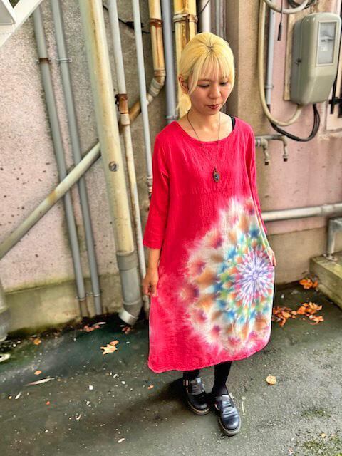 タイダイ染め Tie-dye 長袖ワンピース 深緋色(こきひいろ) 幻想的な曼荼羅模様 HD22-43