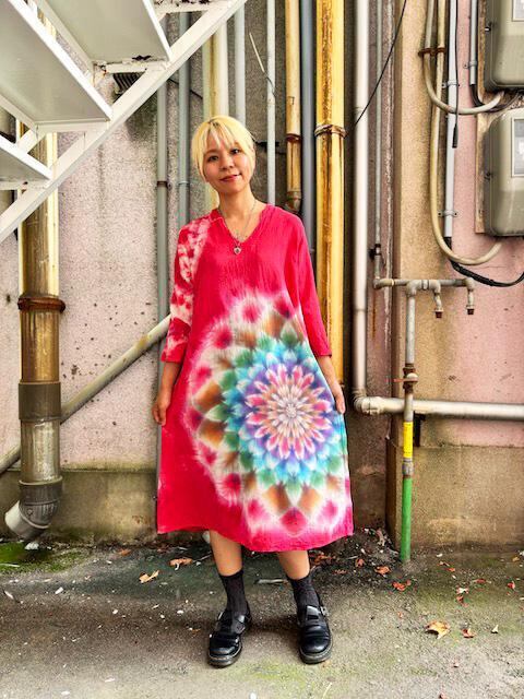 タイダイ染め Tie-dye ゆったりワンピース 優しい紅赤色に幻想的な大曼荼羅 Hippies Dye最新作 HD22-49